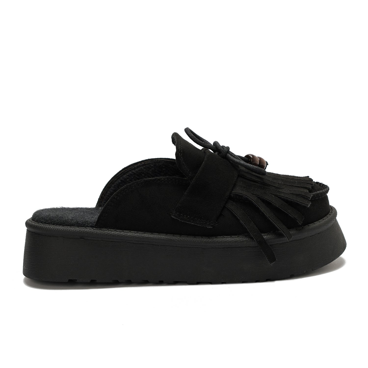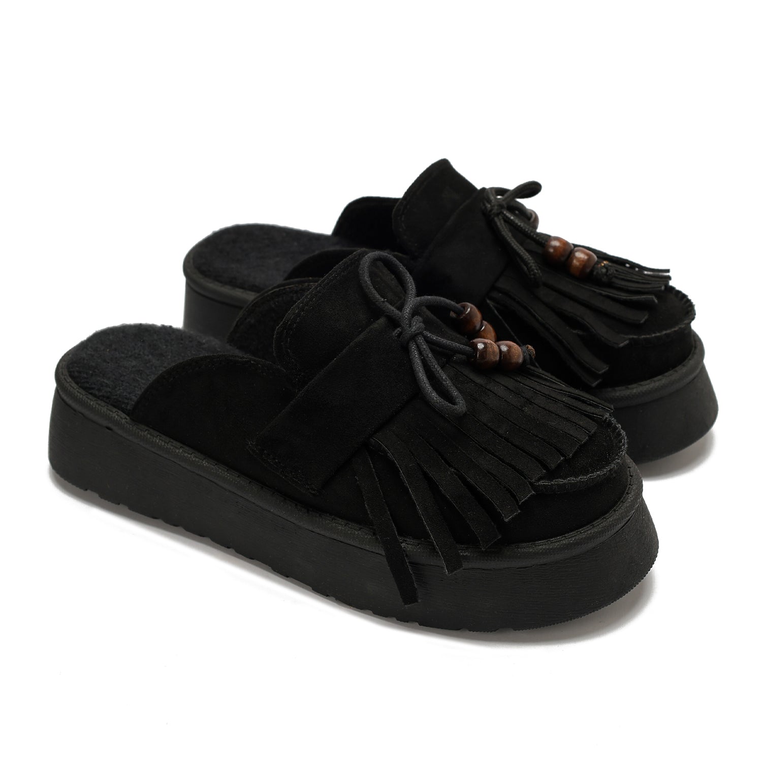 Elevate your casual style with these uniquely designed platform clogs. Crafted from soft, high-quality faux suede, these mules feature a striking fringe detail across the vamp, accented with wooden-style beads on adjustable drawstring ties. The chunky platform sole provides both height and stability, while the plush padded footbed ensures all-day comfort. Perfect for adding a bohemian touch to any outfit