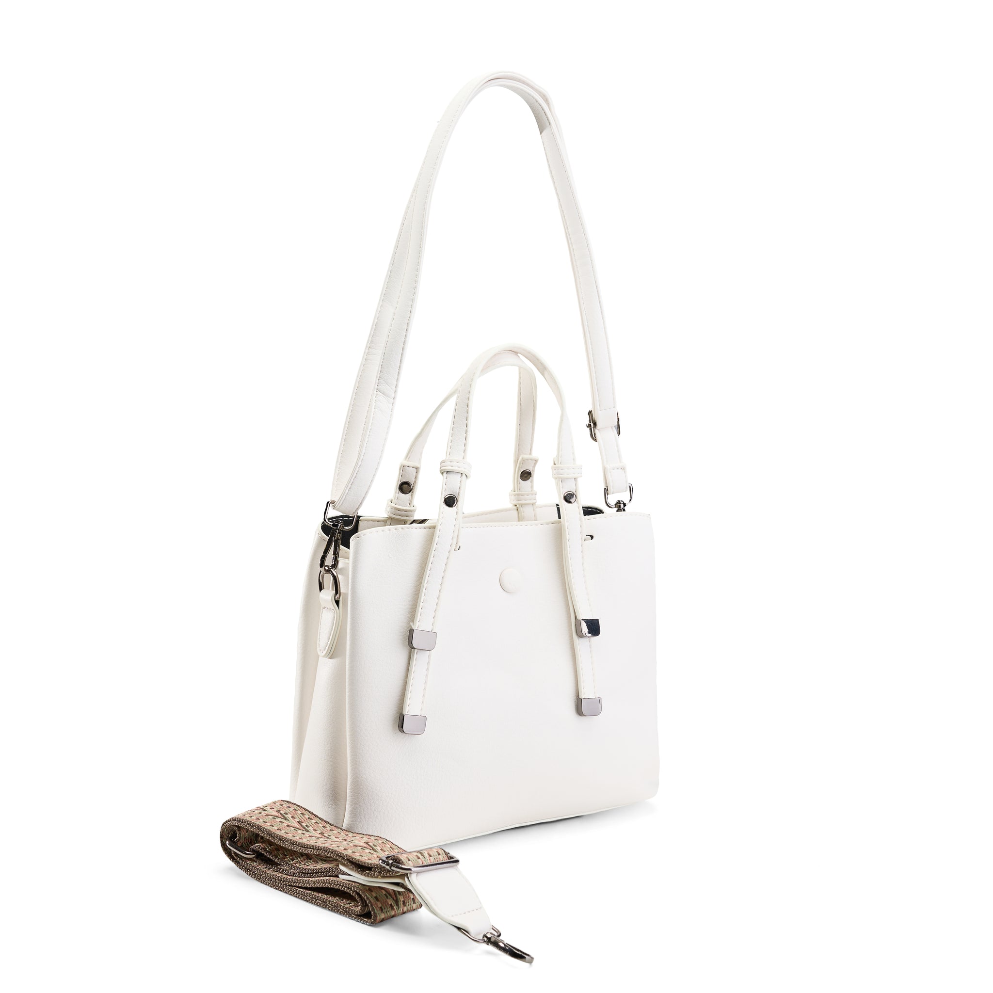 This white top-handle crossbody bag brings a fun twist to your everyday style. Compact yet roomy, it’s perfect for carrying your essentials with a pop of brightness. Switch effortlessly from hand-held chic to hands-free convenience and let this bag be your new playful companion.