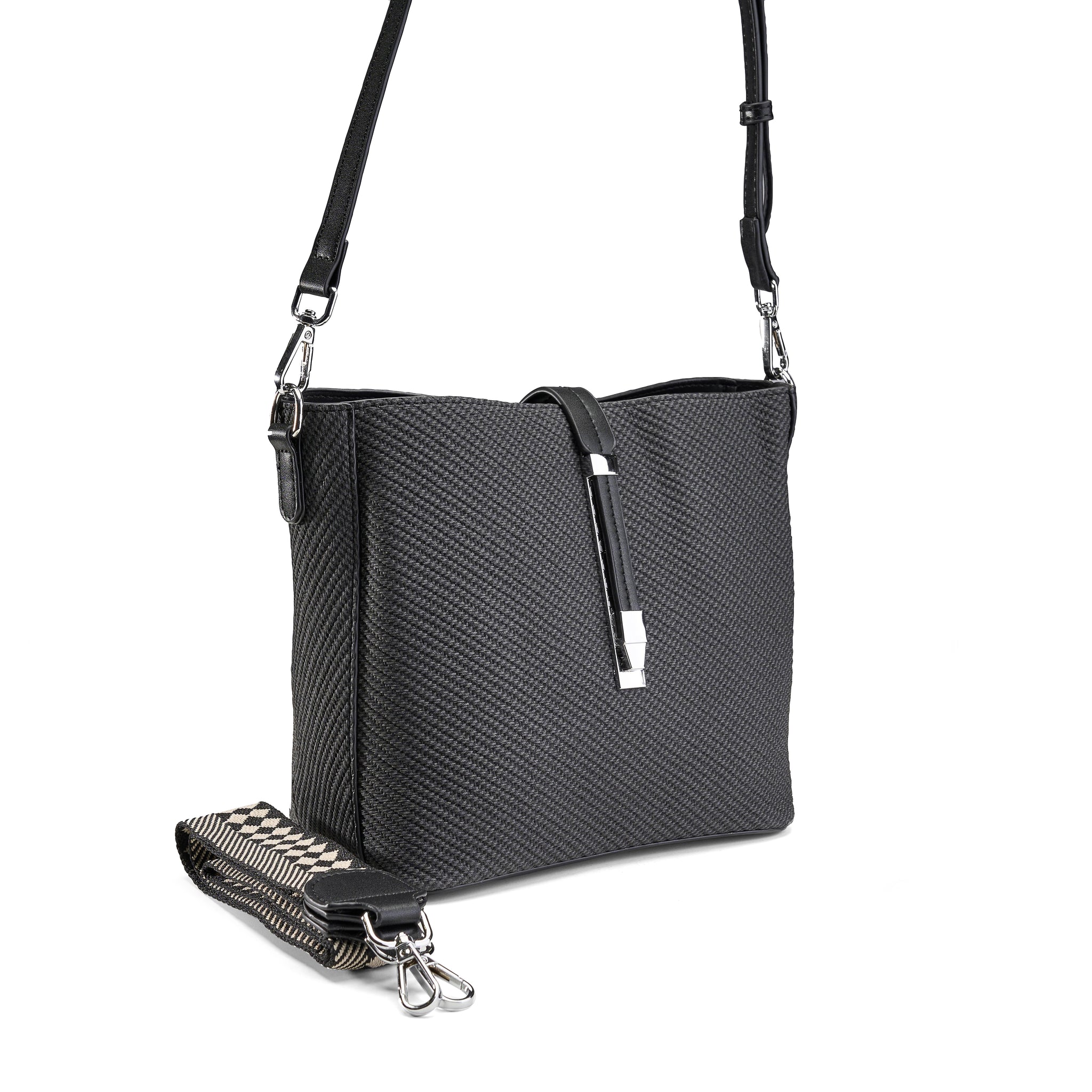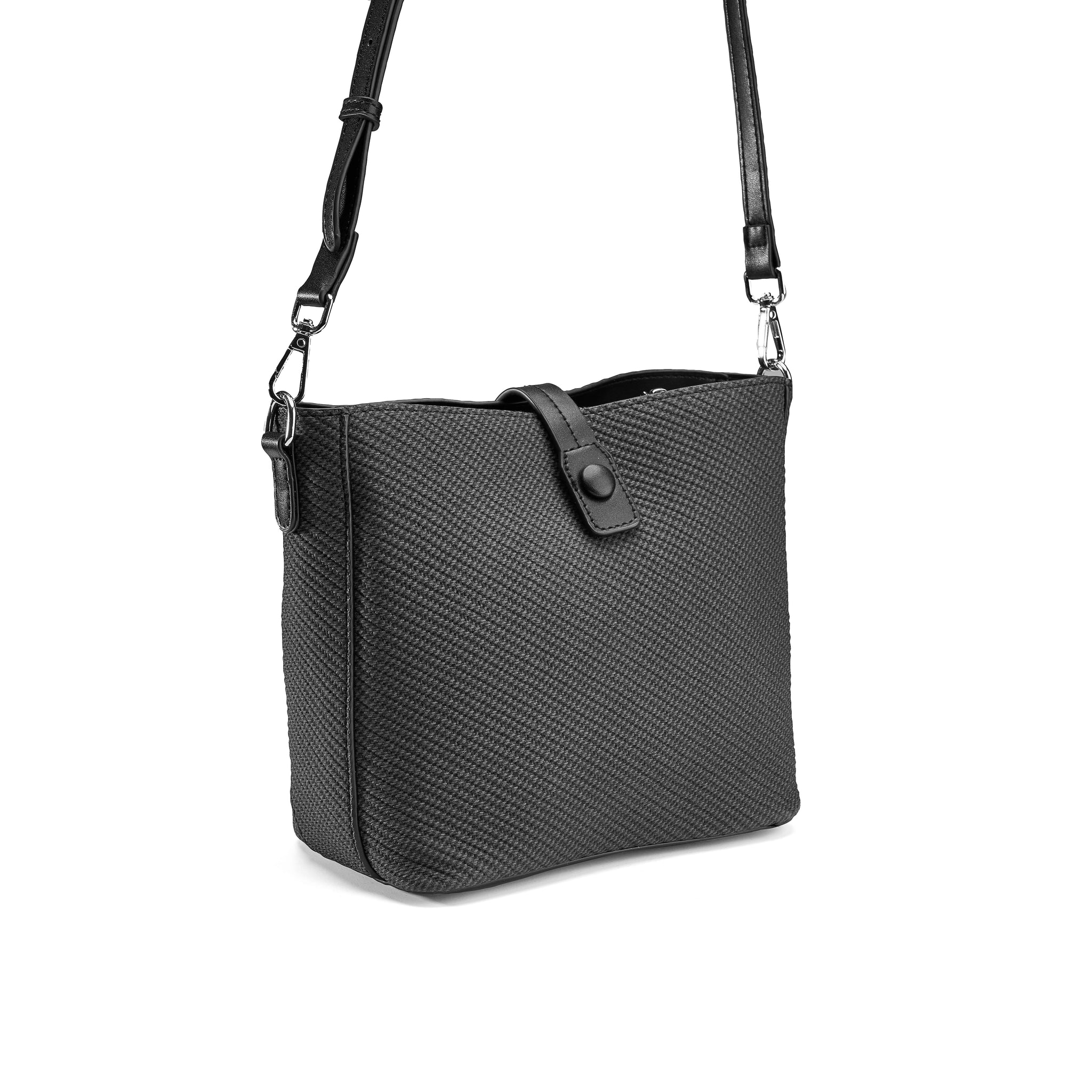 Add a splash of fun to your look with this Woven Textile Bucket Crossbody in black. Its unique woven design brings texture and charm, while the compact bucket shape keeps your essentials close without weighing you down. Perfect for hands-free adventures, this playful bag blends style and practicality effortlessly.