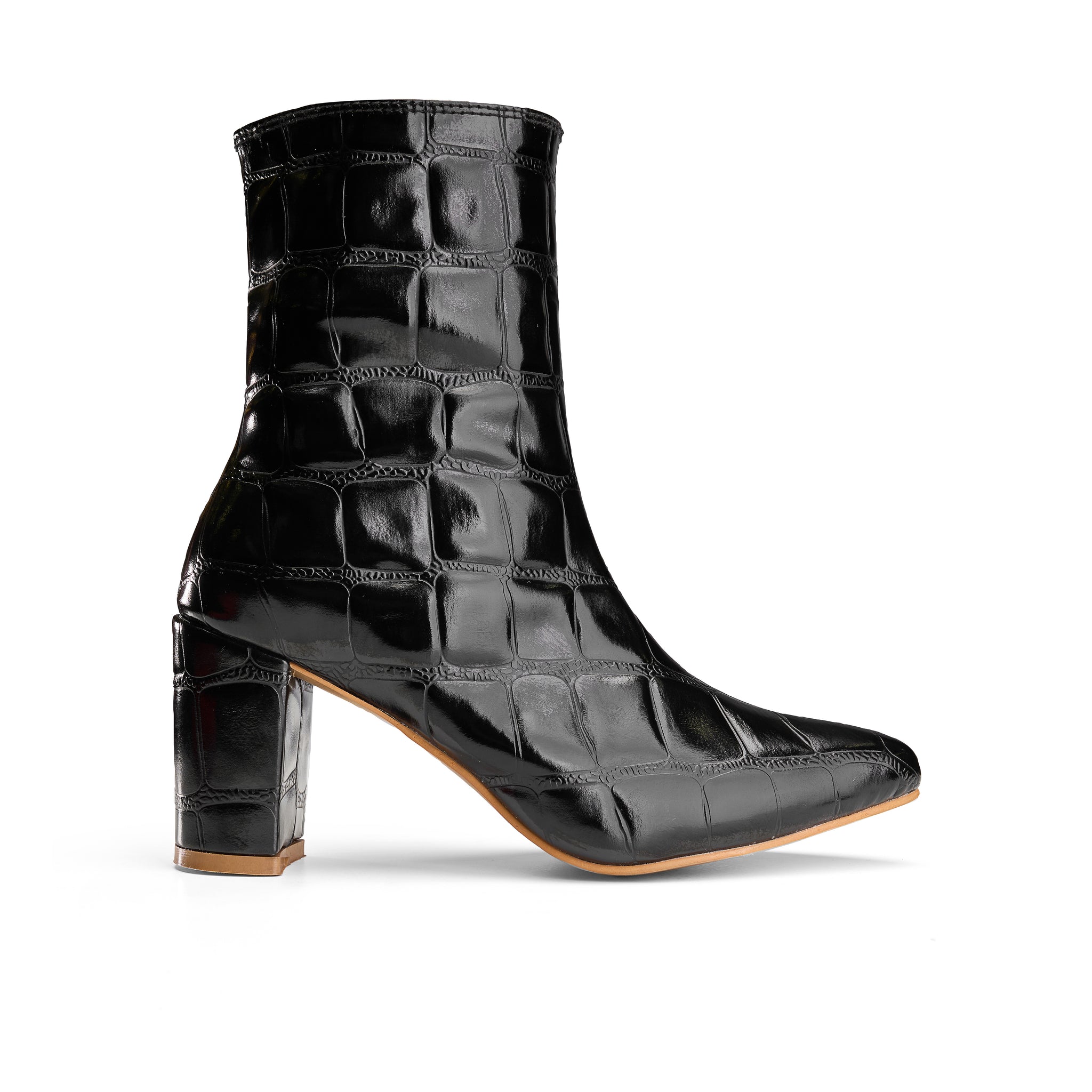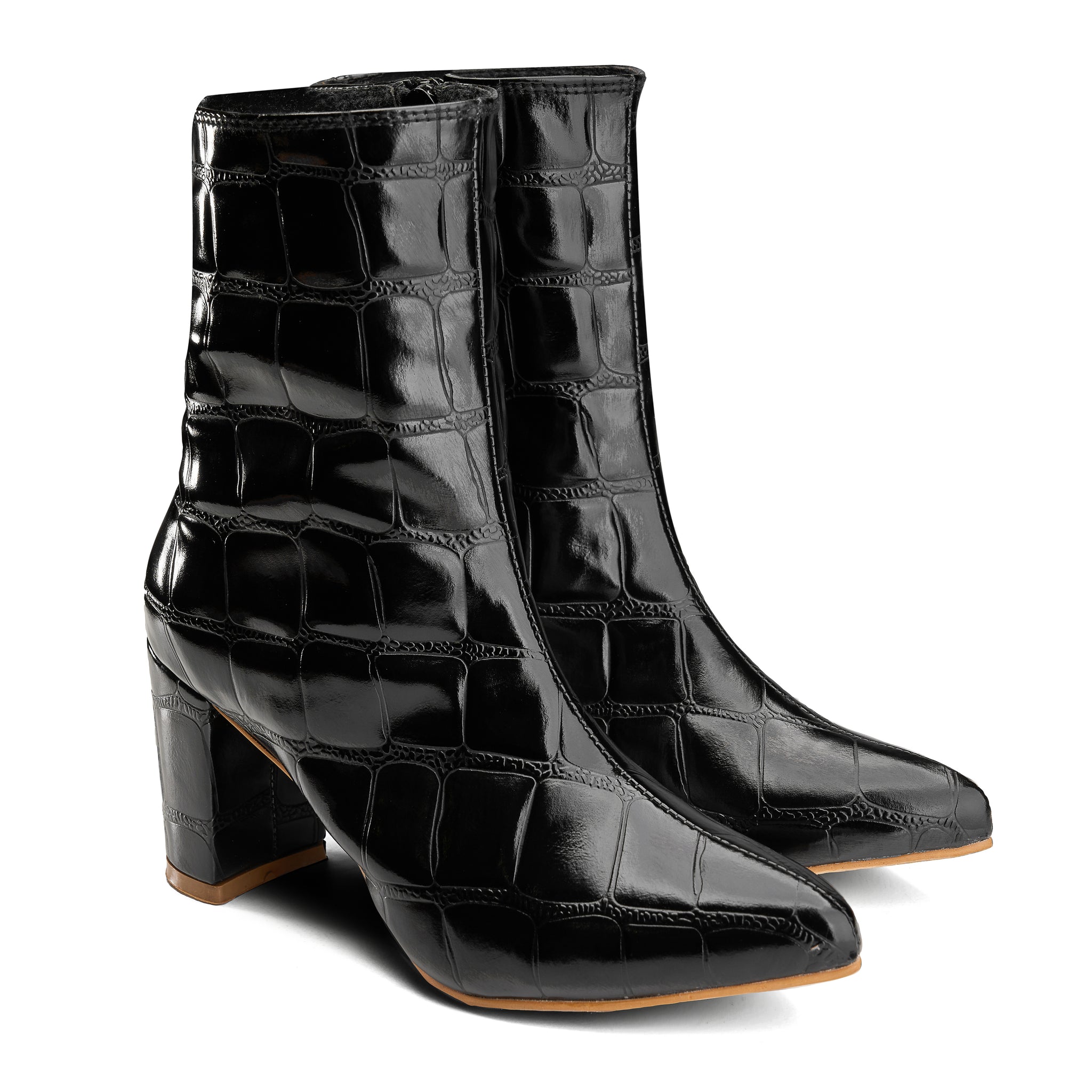 Step out in style with these Black High-Heel Croc Ankle Boots. Their sleek crocodile texture adds a bold edge, while the sturdy heel gives you confidence and height. Perfect for turning heads day or night, these boots combine fashion and attitude to keep your look effortlessly fierce.