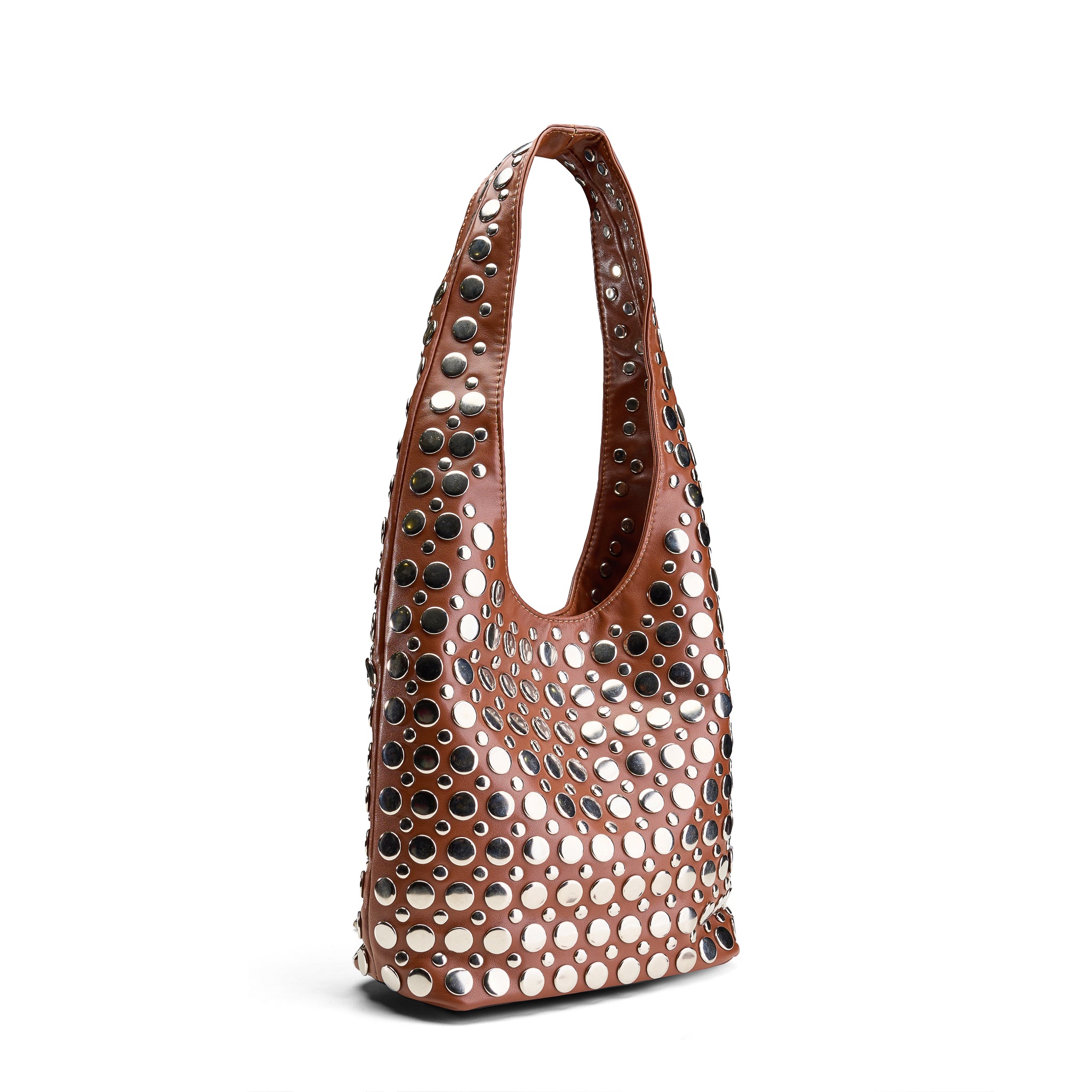 Add a pop of shine to your everyday look with the Mirrored Stud Hobo Bag in warm camel. Its spacious silhouette fits all your essentials, while the playful mirrored studs add a fun, eye-catching twist. Perfect for those who love style with a bit of sparkle and a whole lot of personality.