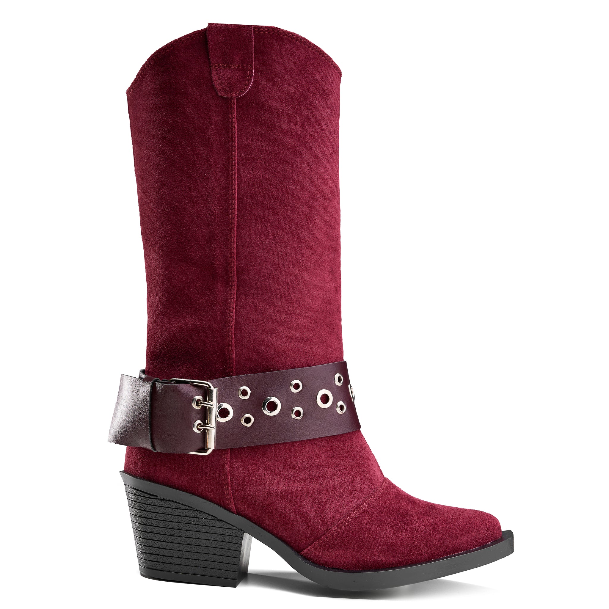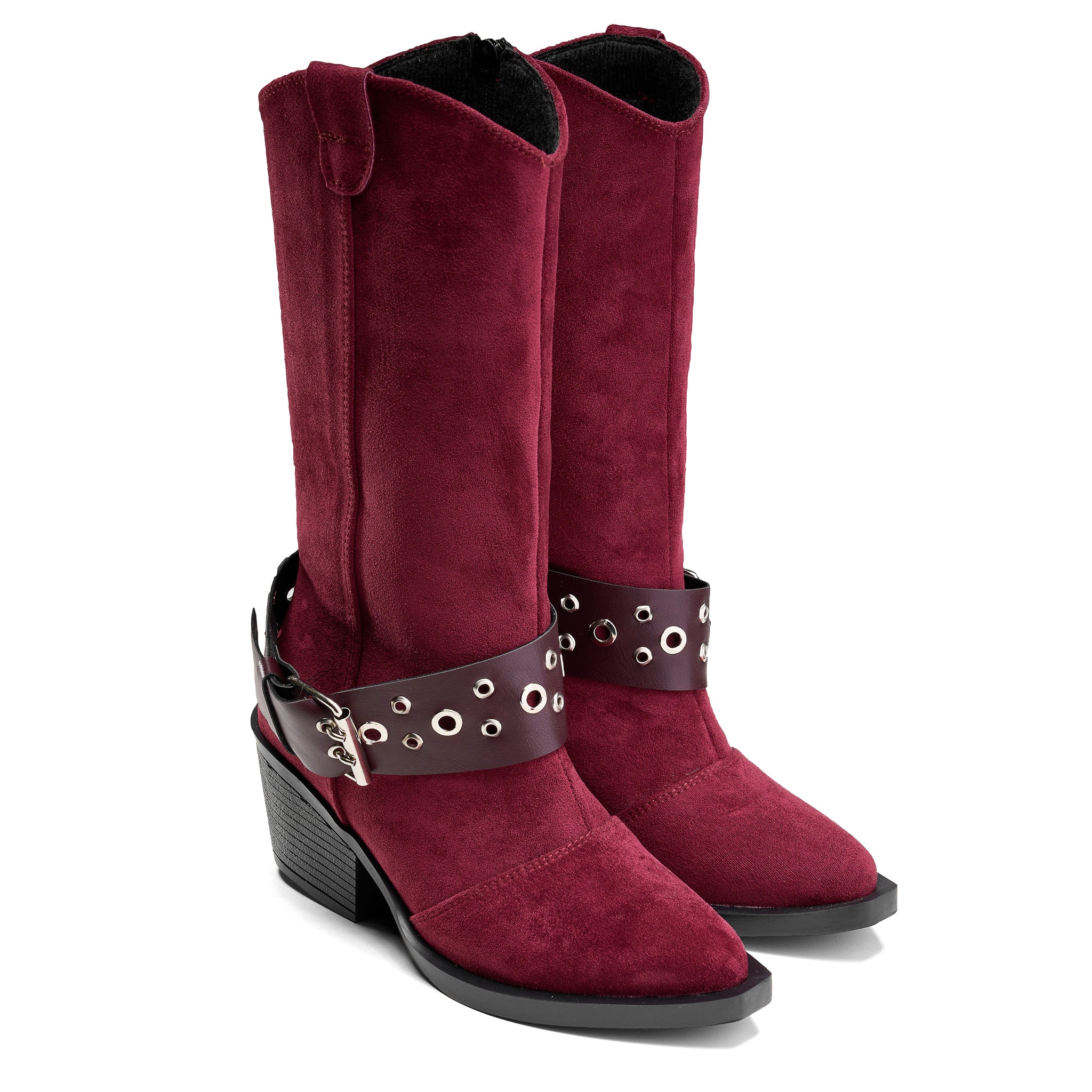 Suede Studded Harness Boot - Maroon