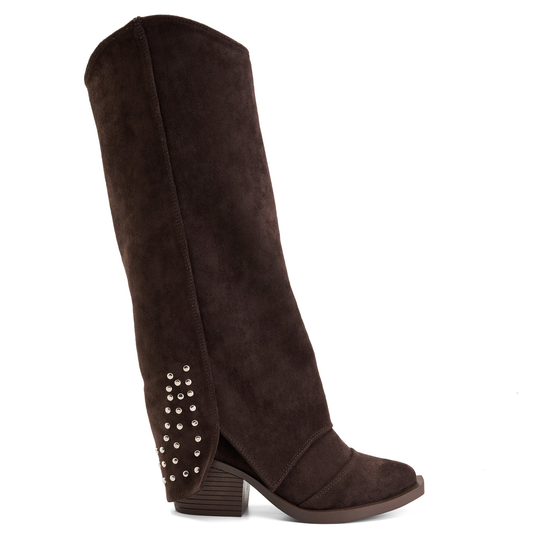 Strut into winter with serious style in these studded long suede boots. The rich brown suede hugs your leg while edgy studs add just the right amount of attitude. Perfect for turning heads whether you're hitting the town or just running errands. Comfort meets cool in a boot that's ready for anything.
